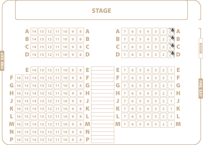 The 4 seats marked as disabled are standard seats which can be removed to accommodate wheelchair users. Rows E-P are tiered and therefore unsuitable for wheelchair users or those patrons who may have difficulty with steps.
